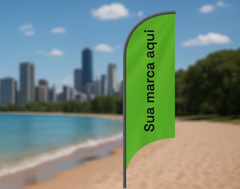 Os wind banners contam com impressão em dupla face e acompanham kit completo, com a haste em fibra de vidro e base. Esses acessórios também são opcionais e comprados individualmente.